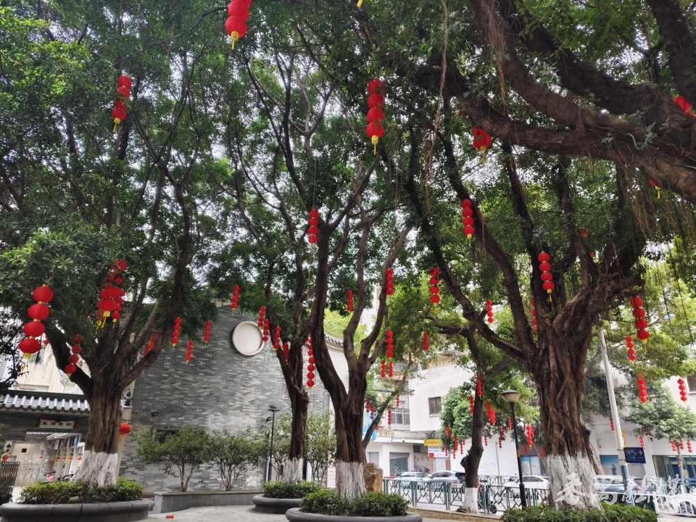 记者散步在东涌路,昂首可见一串串红灯笼沿街整皆吊挂,绵延数百米。灯笼与公园内的绿植景不雅逸趣横生,将整条街谈装点得暖意融融、喜气洋洋。