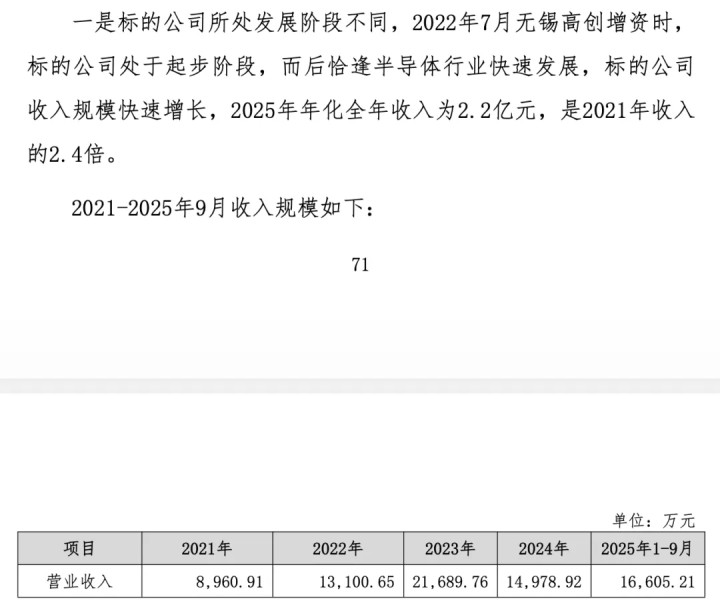 2022年7月后,无锡高新区旗下的国资机构“高创创投”增资入股,这成为公司被收购前独逐个次引入外部市集化股权成本,估值也初度脱离1元/股的里面订价,彼时的增资价钱为12元/股。