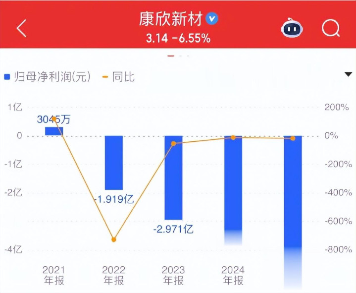 履行财务数据的惨烈进度远超说话上的跟蜻蜓点水。康欣新材从2021年归母净利润3045万元,跌入逐年扩大的蚀本幽谷:2022至2025年,四年累计蚀本卓越12亿元。