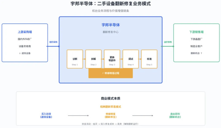 对于宇邦半导体的中枢业务——“集成电路晶圆制造中枢前说念树立装备”,如果剥掉对于其运营模式的专科包装,这门生意的中枢动作庸俗来讲便是:回收大厂退下来的半导体开采,对其翻新后转售。