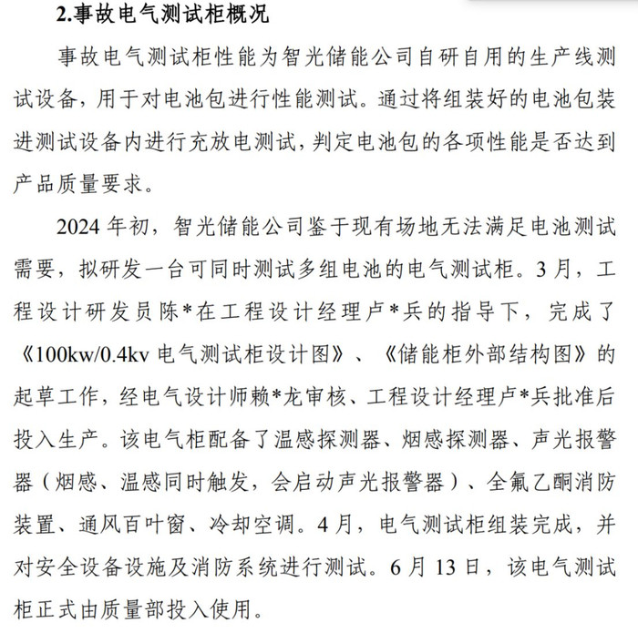 2024年头,亚搏体育app中国最新版本智光储能鉴于现存场合无法娇傲电板测试需要,拟研发一台可同期测试多组电板的电气测试柜。4月,电气测试柜拼装完成,并对安全建筑设施及消防系统进行测试。6月13日,该电气测试柜正经由质料部干与使用。这也意味着,事故发生于该电气测试柜干与使用的次日。