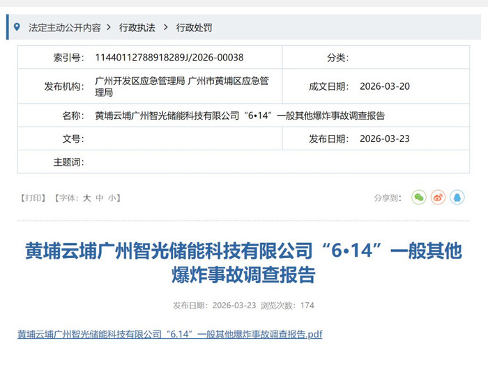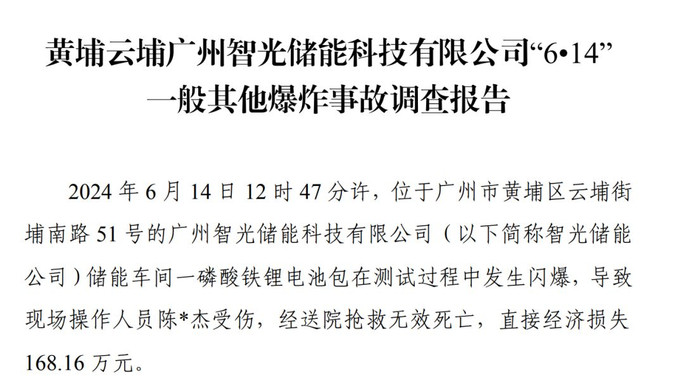 证据广州市黄埔区救急管理局公布的《黄埔云埔广州智光储能科技有限公司“6·14”一般其他爆炸事故造访讲演》,2024年6月14日中午12时47分许,智光储能的储能车间内,一磷酸铁锂电板包在测试经由中发生闪爆,导致现场操作主说念主员陈X杰受伤,经送院抢救无效去世,顺利经济去世168.16万元。