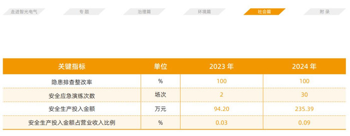 但需要评释的是,记者查询到,按时讲演中,智光电气就“分娩安全”事项公告论说发生转换:其2023年社会包袱讲演明确先容,2022年及2023年度“安全分娩事故数”均为零,但2024年的ESG讲演中,不异是对安全分娩的先容,则莫得“安全分娩事故数”模式。这一年,该企业安全救急演练次数由此前的2次增多至30次,干与金额也翻倍增多。
