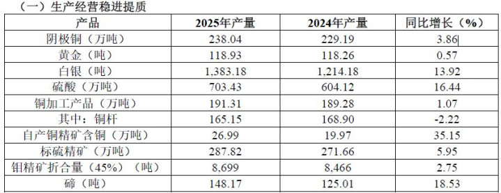 呈报期内,江西铜业主营家具产量均录得增长:阴极铜产量达238.04万吨,同比增长3.86%;黄金产量为118.93吨,同比微增0.57%;白银产量达1383.18吨,同比增长13.92%;硫酸产量703.43万吨,亚搏体育app中国最新版本同比增长16.44%;“自产铜精矿含铜”产量达26.99万吨,大幅增长35.15%(含第一量子矿业公司以前权力产量)。