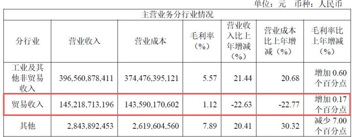 分行业来看,行为公司营收进犯构成部分的生意业务,在2025年出现了权贵下滑。数据泄漏,2025年公司生意收入为1452.19亿元,同比下落22.63%。这标明公司在传统巨额商品生意规模的限制正在快速缩短,进而连累了全体营业收入的增长速率。