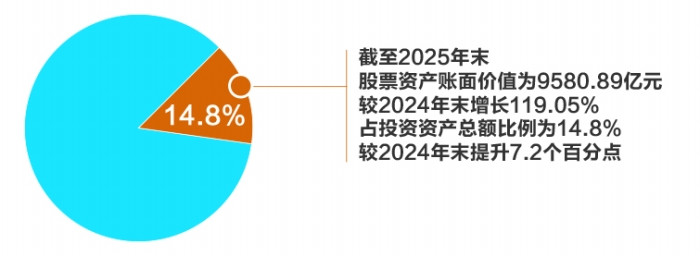 终止2025年末,中国祥瑞股票财富账面价值为9580.89亿元,较2024年末增长119.05%;股票财富占投资财富总和比例为14.8%,较2024年末升迁7.2个百分点。业内东谈主士合计,股票财富账面价值大幅升迁可能受两方面身分影响:一是加大股票财富投资;二是握有股票财富增值。
