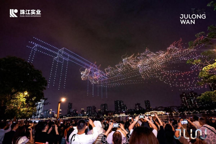 发布会当晚稀疏举办“榕仓水花 水岸腾达”“源起之地 聚浪涌新”聚龙湾品牌无东说念主机灯光秀,5000架无东说念主机递次腾空,刷新广州史上最大边界无东说念主机扮演记录。整场上演以光影为前言,串联起这片地盘从千年海丝源起、工业期间崛起,到城市更新焕新的完满叙事。这场展演,既是对聚龙湾历史文脉与地域特质的具象化抒发,亦然对珠江实业集团与广州城市共生共长流程的无声回望,为品牌亮相赋予了深厚的东说念主文与期间底蕴。