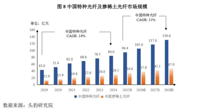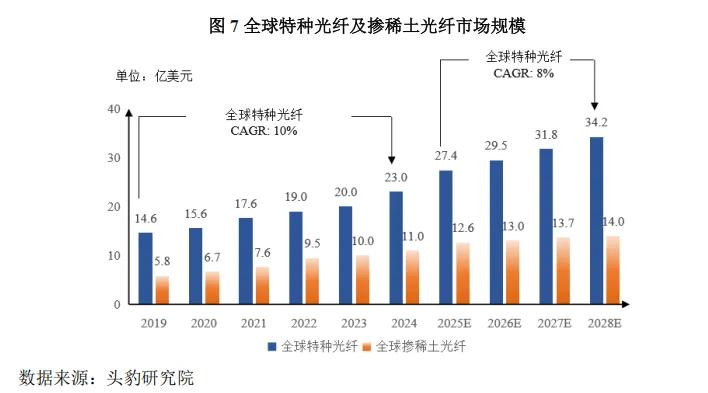 证实头豹接洽院数据,众人掺稀土光纤商场领域2024年达15.5亿好意思元,预测2028年将增长至22亿好意思元,年复合增长率7.2%;