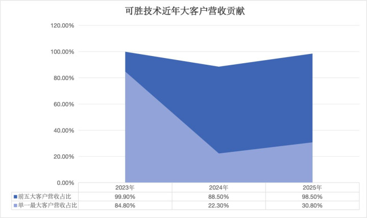 更高的市集荟萃度给可胜技艺带来的是对大客户的依赖。招股书袒露,2023年至2025年,前五大客户真的包揽了可胜技艺的一齐营收,且单一最大客户的营收占比一度逾越80%。公司在招股书中坦言,任何主要客户的流失或其需求减少齐可能对公司财务景况和策划功绩形成紧要不利影响。