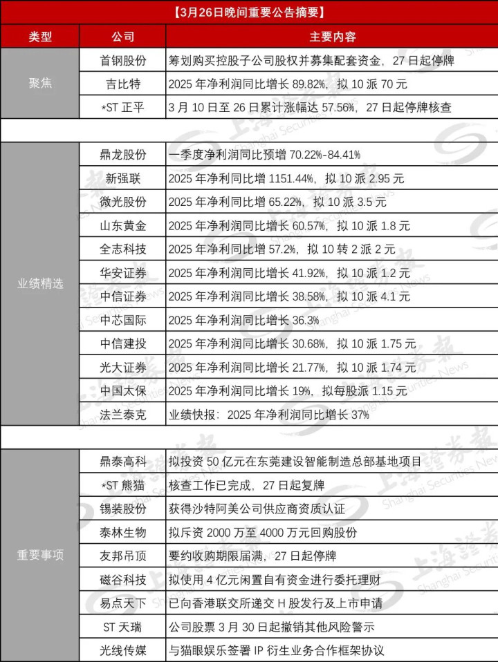 山东黄金:走漏年报。公司2025年达成营业收入104,287,391,583.12元,同比增长26.38%;包摄于上市公司激动的净利润4,739,393,120.72元,同比增长60.57%;基本每股收益0.94元。公司拟向全体激动每10股派发现款红利东说念主民币1.80元。