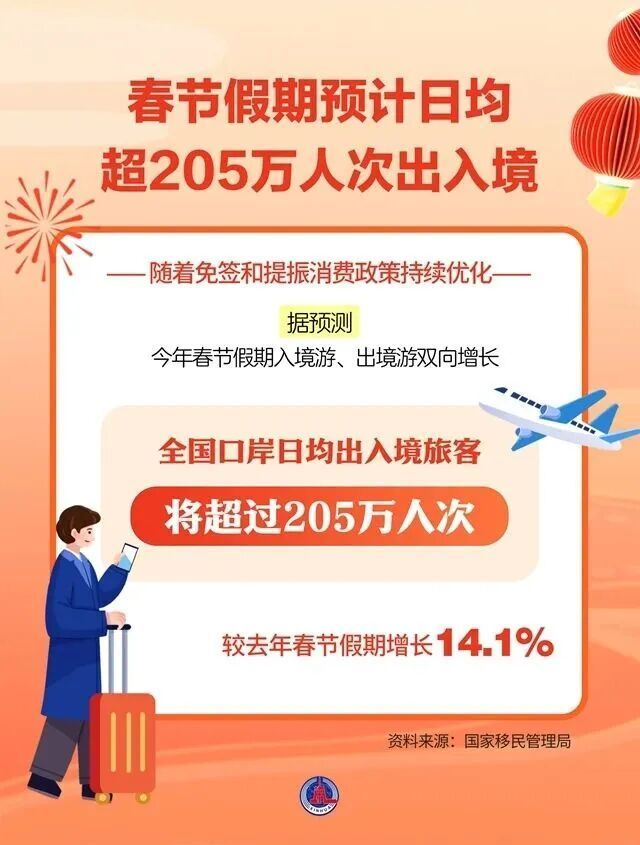据国度外侨处理局音书,跟着免签和提振奢侈计策握续优化,据揣度,本年春节假期入境游、出境游双向增长,宇宙港口日均相差境搭客将提高205万东谈主次,较客岁春节假期增长14.1%。