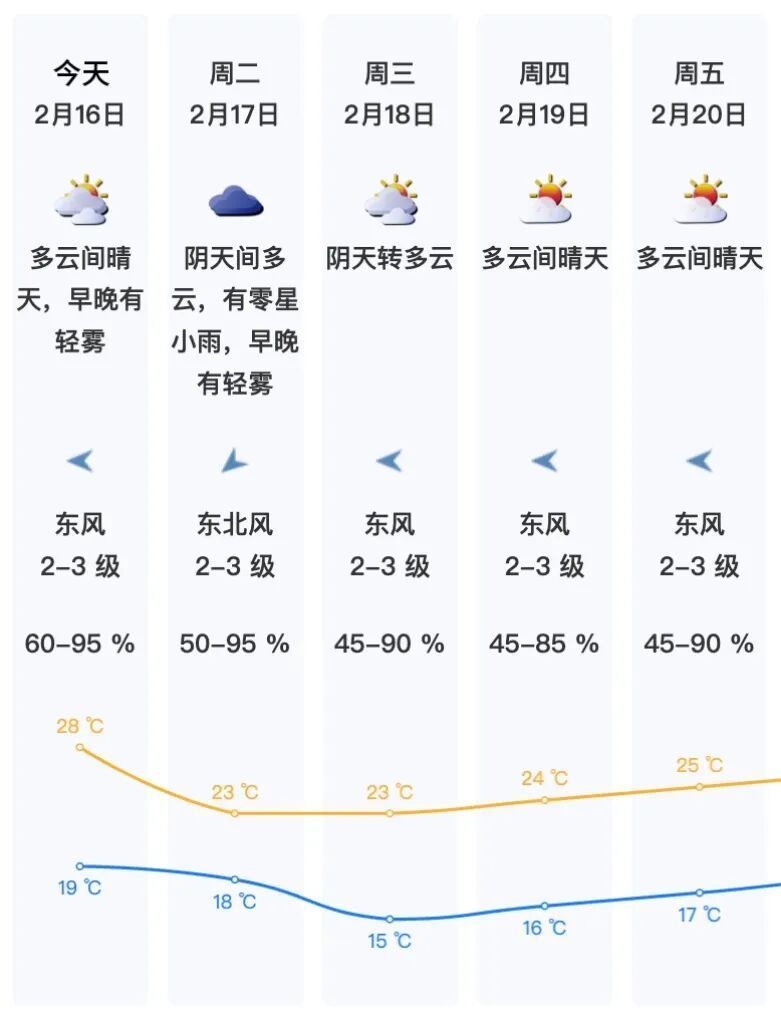 【当天天气】白日多云,天气温文,气温19-28℃,夜间到17日(月朔)云量加多,偶有稀薄小雨。