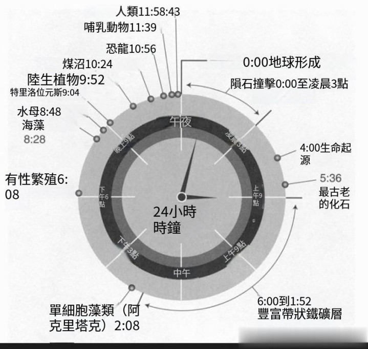 20.要是把地球历史压缩成24小时,那么人命会出咫尺凌晨4点,陆地植物出咫尺晚上10点24分,恐龙解除发生在晚上11点41分,而东谈主类历史则要到晚上11点58分43秒才初始。