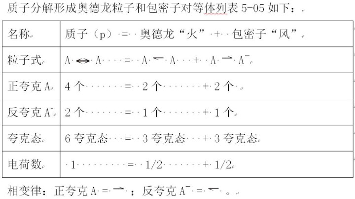 质子可领会为奥德龙粒子和包密子的平等体,其实即是被咱们象征为“火”和“风”的暗能量矛盾粒子。参见表5-05。依此类推,包括质子在内的四种矛盾重子均可领会为暗能量矛盾粒子的平等体。