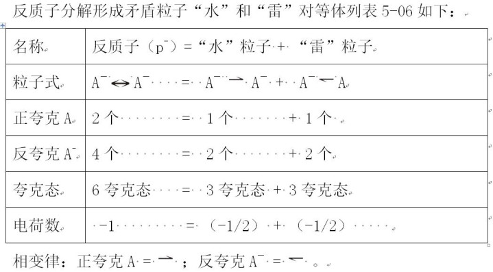 当两个反质子以接近光速的速率互相碰撞时,在某些情况下不会落空,而是相互反弹并散射,会在极短时期内造成矛盾粒子“水”和“雷”的平等体。参见表5-06。