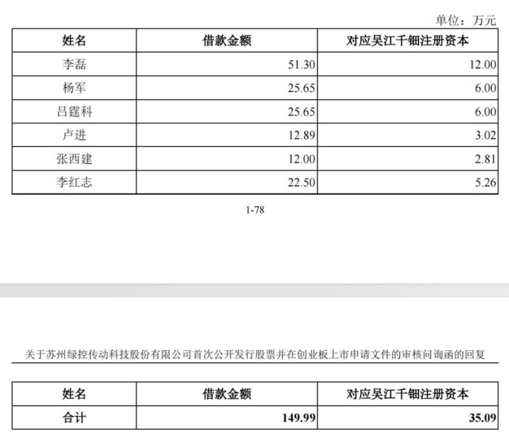 2013年12月,绿控传动曾借款给李磊、杨军、吕霆科、卢进、张西建和李红志,用于股权激发出资,借款金额共计149.99万元,均已偿还。