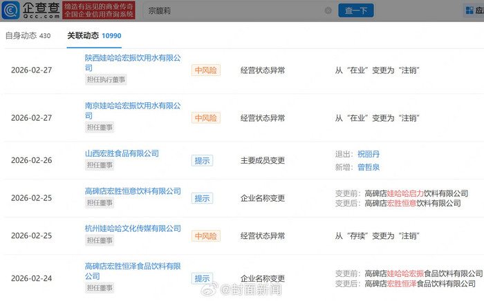 开云(中国)官网 宗馥莉近期刊出名下多家娃哈哈关系公司